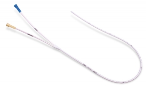 1 catéter de PVC doble-lumen. Lumen de llenado con dos orificios en extremo distal y conector Luer azul. Lumen de registro con un orificio en extremo distal y conector Luer cristal. Marcas de profundidad.Medidas